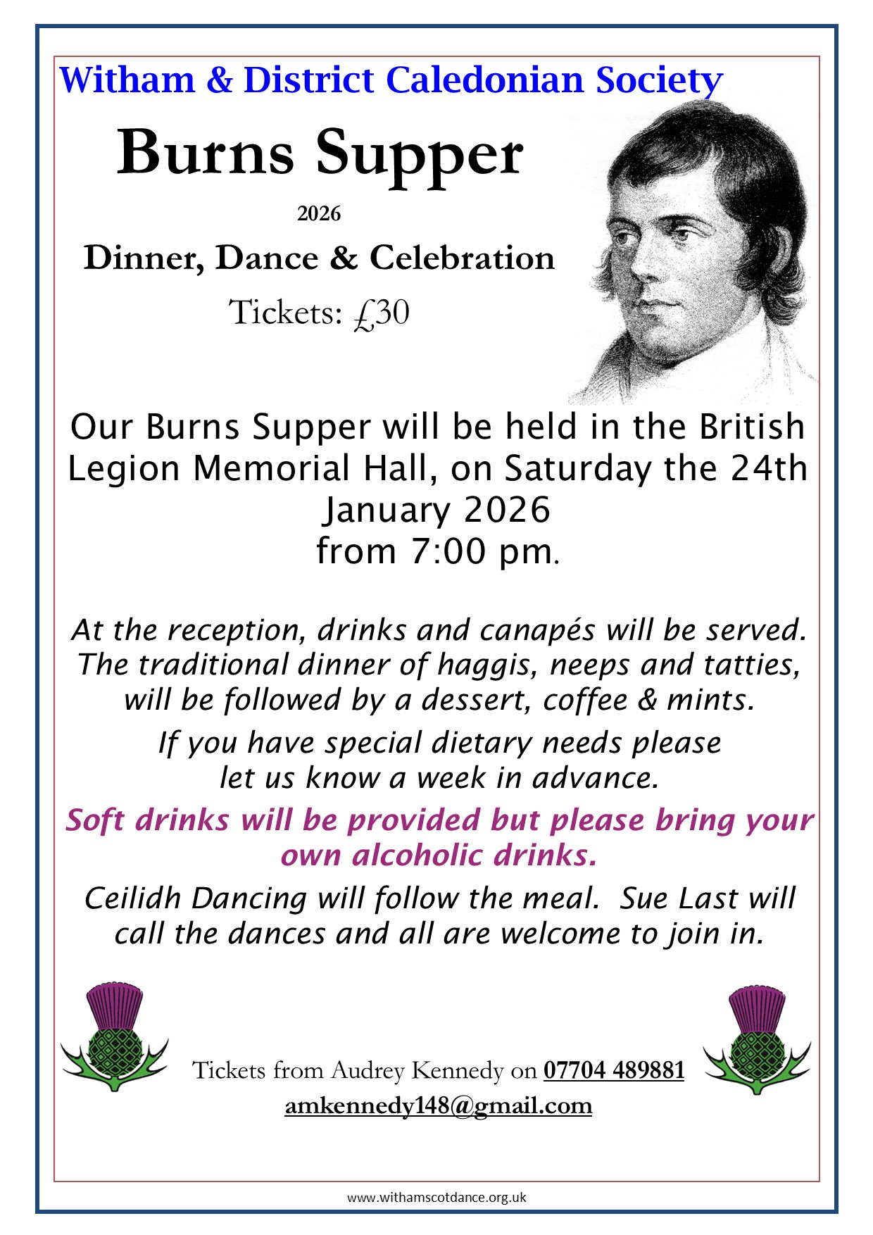 Our next event is our Burns Supper which will be held on the 24th of January 2026 in the British Legion Hall in Witham. Tickets are priced at £30 and are available from Audrey Kennedy. The evening will start with a reception and welcome by our president, Mrs Mary McClean. There will be drinks including sherry, wine and fruit juices. Canapes will be served during the reception. By serving drinks and nibbles during the reception the time for the main meal, Haggis ceremony and speech will be shortened making more time for ceilidh dancing at the end of the night. To add a polished touch to the proceedings Sue Last will be leading us in the last hour with a selection of easy dances all of which will be called as we go along.